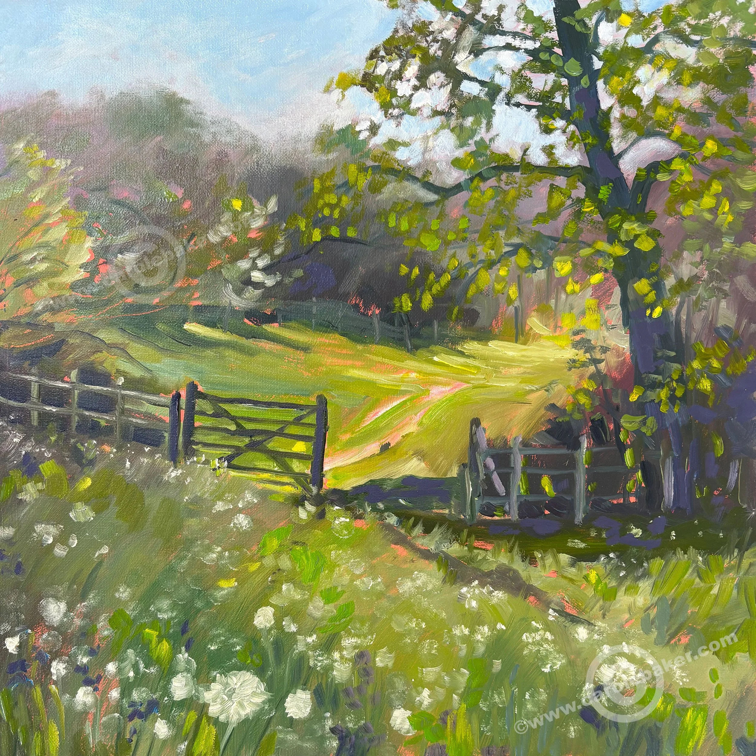 While painting bluebells in the Spring, I paused, turned 45°, and was immediately struck by this quietly enchanting view. The dandelion clocks shimmered like tiny lanterns against the lush greens, lit beautifully by the spring light. The play of shadow and brightness gave the scene such depth and energy—and then there was that gate, just waiting to be walked through. It felt like a secret invitation, a gentle reminder that magic often lies just to the side of where we’re looking.